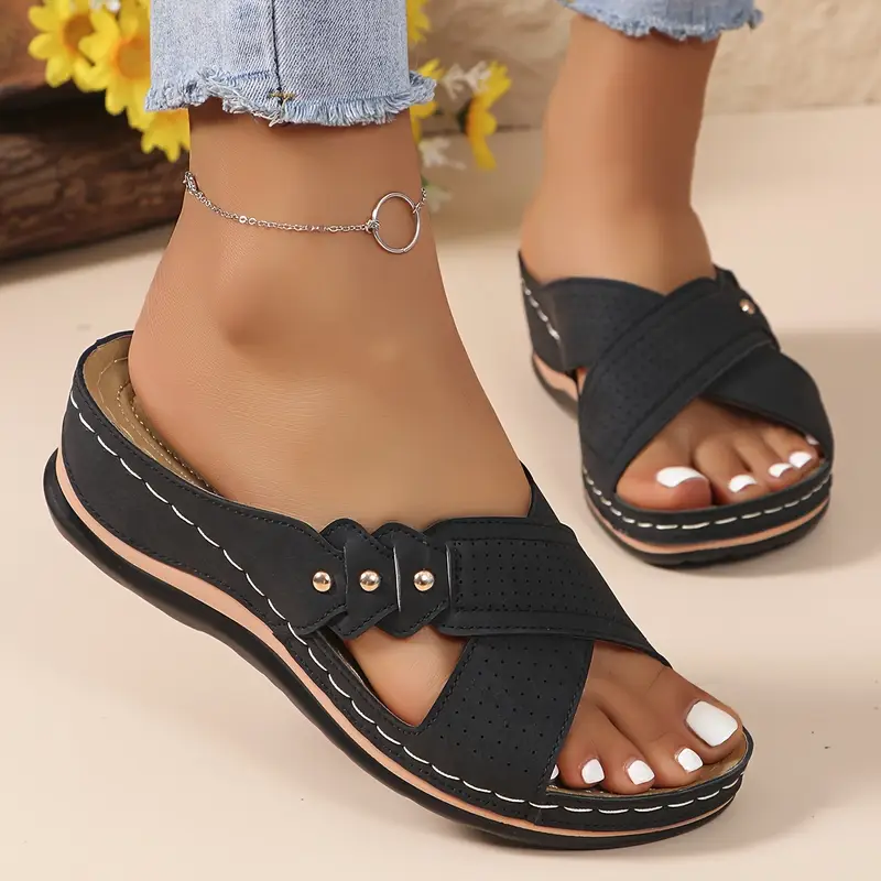 Simply, slip them on and snug your feet in place around the toe clasp for enhanced support.